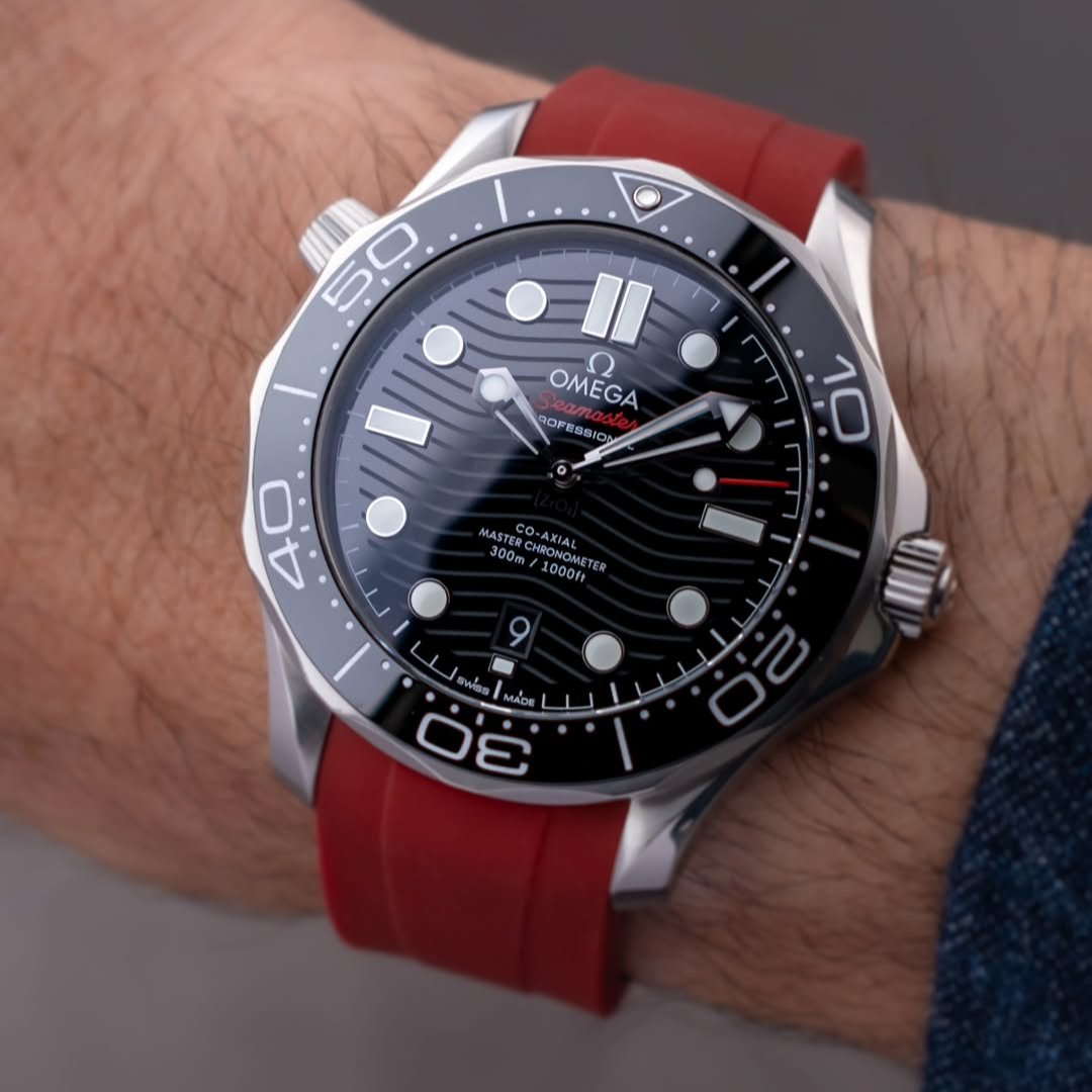 The Seamaster 300M professional paired with a @tempo_mat 20mm integrated Bordeaux rubber strap..